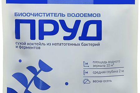 Биоочиститель вовоемов Пруд. Предназначен для водоемов загрязненных органикой, пораженных цветением и мутностью воды. Средство очищает воду, понижает уровень донного ила и отложений органических веществ, восстанавливает кислородный режим, ускоряет отмирание патогенных микроорганизмов. Создано российскими учеными на основе микроорганизмов постоянно присутствующих в почвах России. Средство нетоксично для человека, животных, растений.