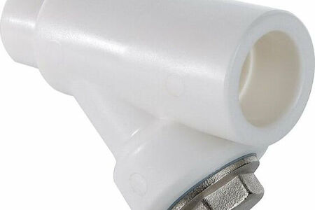 Фильтр с корпусом из полипропилена и сетчатым элементом из нержавеющей стали марки AISI 304, предназначенный для очистки транспортируемой жидкости от нерастворимых примесей размером от 300 мкм. Используется в составе систем из полипропиленовых труб c рабочей температурой до 90 градусов Цельсия и при номинальном давлении (PN) 25 бар. Пробка и закладная деталь фильтра выполнены из латуни марки CW617N, никелированы, уплотнительная прокладка - из синтетического каучука EPDM. Монтаж фильтра производится методом раструбной сварки. Присоединения - внутреннее/наружное.