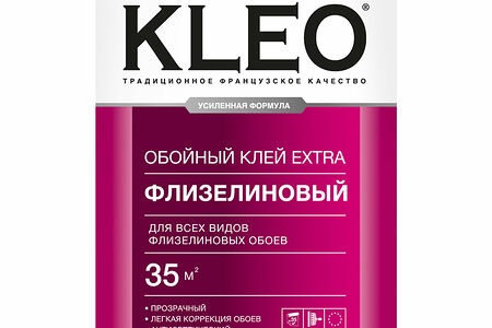 Обойный клей для любых флизелиновых обоев KLEO EXTRA 35 используют во время ремонтных и отделочных работ для надежного приклеивания всех видов флизелиновых обоев любой ширины, а также малярного (ремонтного) флизелина. Продукт подходит для обоев под окраску. Сохраняет прозрачность после нанесения. Обои легко корректируются при наклейке. Состав содержит модифицированный крахмал, антисептические и противогрибковые добавки. Раствор легко наносится валиком или машинным способ без подтеков и разбрызгивания.