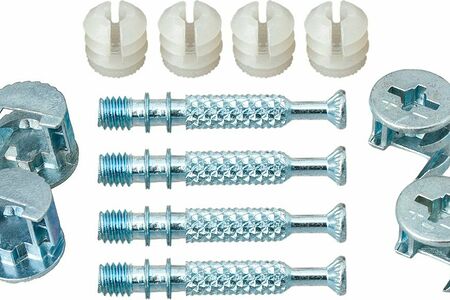 В комплект входит: втулка-саморез для эксцентриковой стяжки 7х45 (4шт.), эксцентриковая стяжка для ДСП 18-20мм (4 шт.), дюбель мебельный пластмассовый М6 (4 шт).