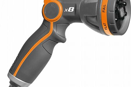 Оснащен регулировкой интенсивности распыления в 8 режимах от слабой до жесткой струи для эффективного полива участка.