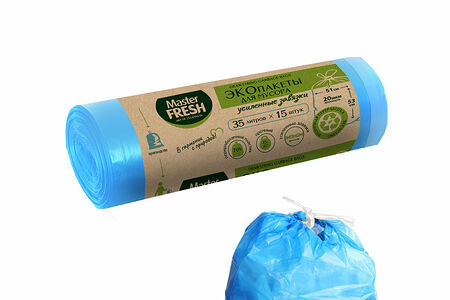 Прочные ЭКО пакеты для мусора Master Fresh на 70% производятся из вторичного переработанного сырья. Подлежат последующей переработке. Таким образом, сокращается вред, наносимый окружающей среде. Повышенная плотность ЭКО пакетов Master Fresh позволяет выдерживать нагрузку до 15 кг! Они оснащены усиленными завязками, которые выдерживают вес до 10 кг. Практичные и удобные в применении ЭКО пакеты мягкие на ощупь, из всей линейки пакетов для мусора их выделяет небесно-голубой цвет. Оптимальный размер пакетов идеально подходит для ведра объемом 15л.