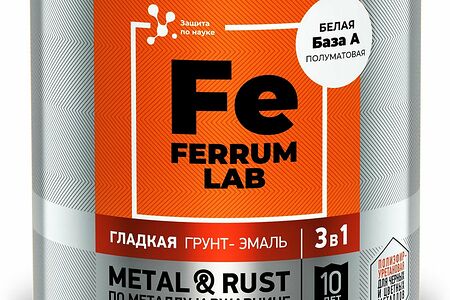Грунт-эмаль FERRUM LAB по ржавчине 3В1 атмосферостойкая с антикоррозийными пигментами применяется для создания износостойкого защитно-декоративного покрытия на чёрных и цветных металлах. Материал обладает повышенной стойкостью к механическим нагрузкам, действию солей, масел, бензинов, благодаря чему имеет широкий спектр применения в промышленности и в быту.