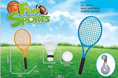 Детский игровой набор - Бадминтон - 2 пластиковых ракетки 39.5x8x3 см, воланчик 9x7 см, мячик 3,4 см, в сетке.