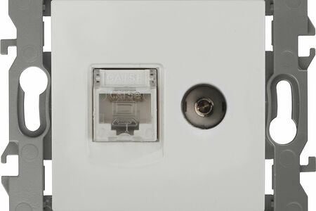 Розетка телевизионная + интернет серии Эра 12 скрытой установки механизм цвет белый 12-3110-01. Сделана из поликарбоната. Монтаж в подрозетник производится и на лапки, и на винты. Рамки приобретаются отдельно. Рамки Эра 12: 1 пост 12-5001-хх, 2 поста 12-5002-хх, 3 поста 12-5003-хх, 4 поста 12-5004-хх, 5 постов 12-5005-хх. Рамки Эра 12 Сатин: 1 пост 12-5101-хх, 2 поста 12-5102-хх, 3 поста 12-5103-хх, 4 поста 12-5104-хх, 5 постов - 12-5105-хх (хх - код цвета: 01-белый, 02-слоновая кость, 03-алюминий, 04-шампань, 05-антрацит, 06-чёрный, 07-ольха(белёный дуб-сатин), 08-вишня, 09-дуб, 10-венге, 11-сосна, 21-жёлтый, 22-оранжевый, 23-красный, 24-охра, 25-бордо, 26-лайм, 27-зелёный, 28-голубой, 29-синий).
