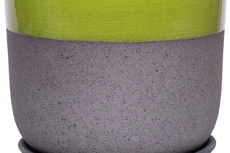 Горшок Контраст выполнен в сочетании матовой рельефной керамики темно-серого цвета и блестящей зеленой глазури. Стильный вазон подходит для выращивания любых растений, красиво сочетается с зеленью.