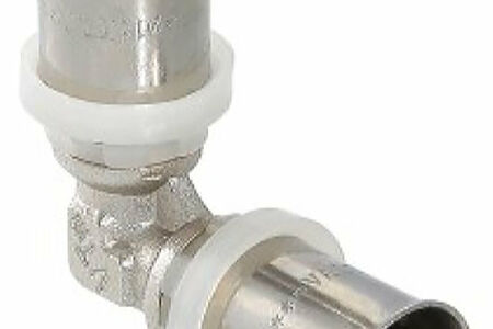 Угловой пресс - фитинг для соединения двух металлополимерных труб равного диаметра. Материал - сантехническая латунь. Диаметр 20 мм Cерия VTm.251.N