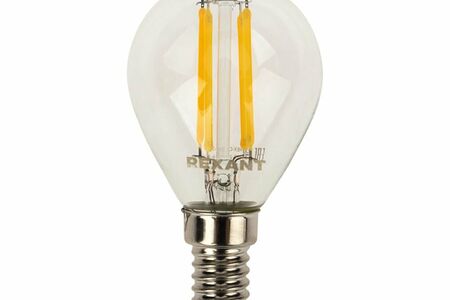 Филаментная прозрачная лампа REXANT GL45 в форме шара мощностью 7.5Вт с цоколем E14 и с теплым белым свечением в 2700K прекрасно подходит для дизайнерского освещения комнат, домов, гостиниц, кафе, и других объектов.