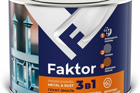 Грунт-эмаль на ржавчину FAKTOR 3 в 1 предназначена для преобразования ржавчины, грунтования и окраски чистых и ржавых металлических поверхностей, включая крупногабаритные конструкции, изделия сложной конфигурации (трубы, мебель, решетки, ограды и т.д.), эксплуатируемые снаружи и внутри помещений.
