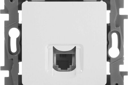 Телефонная розетка Legrand Etika стандарта RJ-11 имеет 4 контакта для подключения телефонного кабеля. Механизм розетки монтируется в стандартную установочную коробку (подрозетник) с помощью распорных лапок либо на винтах.