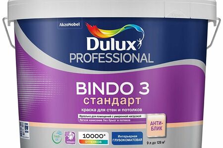 Краска интерьерная Dulux Bindo 3 глубокоматовая база BW - латексное покрытие для внутренней отделки стен и потолков. Наносится на бетон, кирпич, гипсокартон, обои и другие минеральные основания.