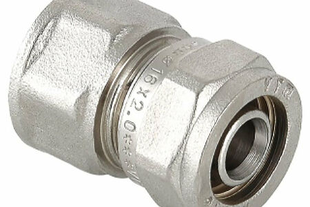 Двухсторонний прямой латунный никелированный фитинг для соединения металлополимерной трубы и компонента системы с резьбовым подключением. Резьба фитинга - внутренняя трубная по ГОСТу 6357, 16 х 3/4"Серия VTm.302.N
