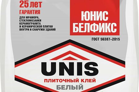 Клей для плитки Юнис Белфикс - белый клей для стеклянной, мозаичной плитки и мрамора. Для укладки стеклоблоков, керамической, мозаичной м стеклянной плитки, плит из природного камня, керамогранита, на стены и полы с подогревом в любых помещениях. Для облицовки фасадов, в том числе цокольной части. Может применяться для облицовки бассейнов и резервуаров с питьевой и технической водой, а также в качестве затирки для плиточных швов. Надежно закрепить мозаичную плитку на горизонтальных и вертикальных плоскостях поможет высококачественный клей для плитки Юнис Белфис. Он подходит для осуществления внутренних и наружных отделочных работ. Отлично склеивает поверхности мрамора, стекломозаики, керамогранита и кафеля. Белый клей можно использовать поверх старой плитки, он устойчив к термическому воздействию, что позволяет применять его для покрытия пола при условии наличия системы "теплого пола". Не меняет своих свойств при низких температурах и обладает высокой водостойкостью.