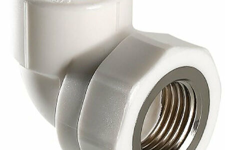 Двухсторонний металлопластиковый фитинг для соединения под углом 90 градусов друг к другу полипропиленового трубопровода и компонента инженерной системы с резьбовым подключением, 20 х 3/4". Резьба фитинга - внутренняя трубная, по ГОСТу 6357.
