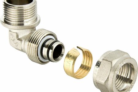 Угловой латунный никелированный обжимной фитинг для соединения металлополимерного трубопровода с компонентом системы, имеющим резьбовое подключение, 20 х 1/2". Резьба фитинга - наружная трубная, по ГОСТу 6357. Cерия VTm.353.N