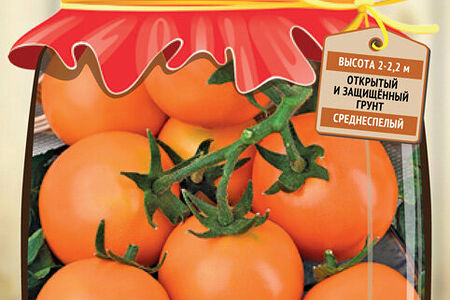 Отличное сочетание высоких вкусовых качеств в свежем и консервированном виде. Индетерминантный среднеспелый гибрид высотой до 2,2 м для выращивания в открытом и защищённом грунте. Период от всходов до начала созревания 112-115 дней. Гибрид обладает генетической устойчивостью к наиболее вредоносным болезням и имеет стабильную урожайность даже при стрессовых условиях. В кисти одновременно наливается 5-7 одинаково ровных плодов уникального ярко-оранжевого цвета, массой до 60 г, сливовидные или грушевидные, гладкие, глянцевые с отличными вкусовыми качествами. Плоды плотные, пригодны для свежего потребления и цельноплодного консервирования. Лёжкие и транспортабельные.