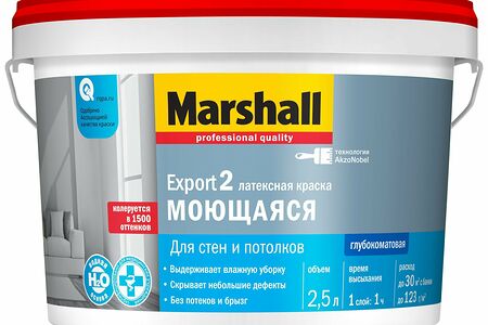 Краска Marshall Export-2 предназначена для окрашивания стен и потолков внутри помещений. Благодаря экологичному составу подходит для использования в детских и оздоровительных учреждениях.