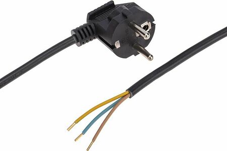 Провод ПВС сечением 3х0,75 мм² номинальным током 10 А с подготовленными (зачищенными) контактами укомплектован литой неразборной угловой вилкой (Евро).