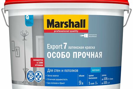 Краска интерьерная Marshall Export-7 матовая белая - надежное покрытие для потолков и стен. Водно-дисперсионный материал равномерно наносится, хорошо перекрывает первоначальный цвет, сохнет за один час, не растрескивается.