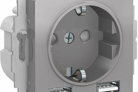 Розетка силовая Schneider Electric AtlasDesign 16А (цвет алюминий) с заземлением и шторками с розеткой USB, с друмя разъемами типа А - Лицевые детали из качественного ABS-пластика, устойчивого к царапинам и УФ-излучению. Заземляющий контакт обеспечивает дополнительную защиту от удара электрическим током. Шторки обеспечивают дополнительную безопасность в доме, где находятся дети. Один механизм позволяет как подключить бытовые приборы, так и зарядить мобильные устройства.