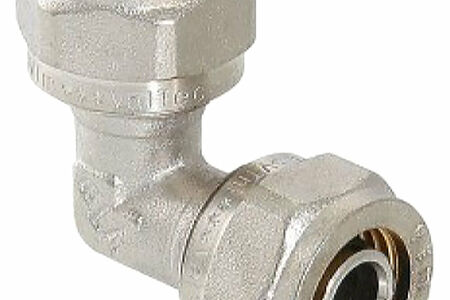 Латунный никелированный обжимной фитинг для соединения двух металлополимерных труб равного диаметра под углом 90 градусов друг к другу. Cерия VTm.351.N