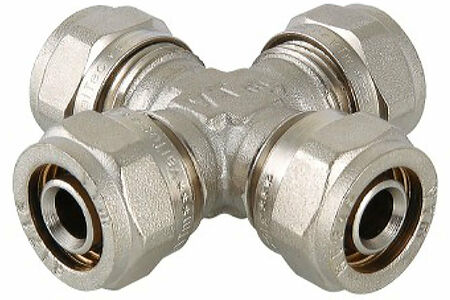 Латунный никелированный фитинг для соединения четырех металлополимерных труб (крестовина). Имеются равнопроходные модели и модели с разными диаметрами "пересекающихся" трубопроводов. Cерия VTm.341.N