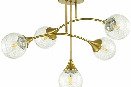 Потолочный светильник имеет необычную форму. Конструкция состоит из металлического основания золотого цвета и пяти шаровидных плафонов из прозрачного стекла. Крепление к потолку осуществляется при помощи монтажной планки.
