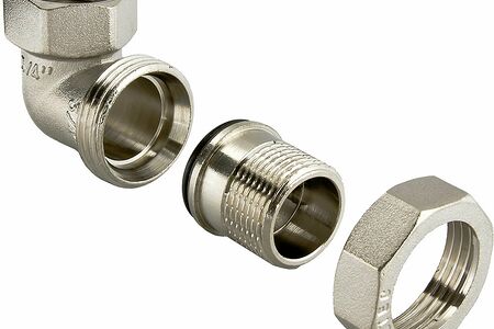 Разъемный угловой сгон, соединение компонентов которого осуществляется накидной гайкой (угловая американка). Материал фитинга – сантехническая латунь CW617N. Детали никелированы.
