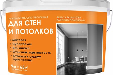 Водно-дисперсионная краска для стен и потолков. Допускает удаление легких загрязнений сухой тканью. Краска легко наносится и характеризуется очень экономичным расходом. Быстро высыхает. Не имеет резкого запаха