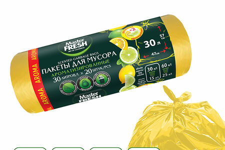 Пакеты для мусора Master FRESH серии АРОМА обеспечивают чистоту и гигиену в квартире. Двойная арома добавка LEMON внедрена в структуру полиэтилена, долго держится, поэтому пакеты даже без упаковки долго не теряют своего аромата. Пакеты для мусора имеют усиленный аромат лимона, который поможет скрыть неприятные запахи. Удобны для сбора и вывоза мусора, занимают мало места, практичны в использовании. Специальная перфорация позволяет легко отделить пакет от рулона.