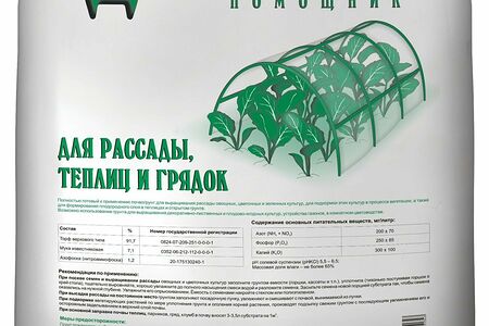Грунт "Добрый помощник" для рассады, теплиц и грядок содержит качественный верховой торф, известняковую муку и необходимые для растений питательные элементы, в том числе: 130 мг/л азота, 130 мг/л фосфора, 160 мг/л калия.