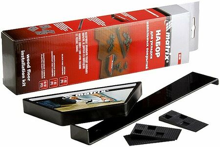 Набор Matrix 88100 используется для правильной укладки напольных покрытий. С его помощью можно гораздо быстрее установить ламинат и при этом получить качественный результат без дефектов и повреждений. Набор включает все необходимое для монтажа: брусок, скобу и распорные клинья. Клинья обеспечивают точность выравнивания первого ряда и возможность регулировки зазора между панелями и стеной. Скоба позволяет подбить последний ряд для плотной усадки. Брусок защищает замок панелей, если нужно подбить стыки молотком.