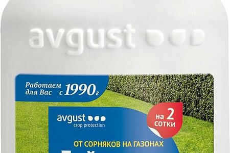 Средство защитное от сорняков на газоне Avgust Деймос уничтожает более 40 видов паразитирующих широколистных трав, в том числе амброзию, борщевик, осот. Основной действующий компонент - диметиламинная соль.