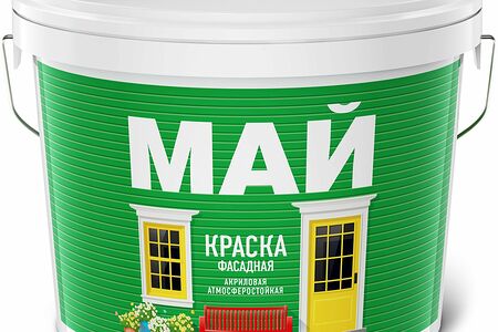 Фасадная атмосферостойкая краска МАЙ рекомендована для покрасочных работ снаружи и внутри помещений, в том числе с повышенной влажностью, по гипсокартонным, бетонным, кирпичным, оштукатуренным и зашпатлеванным поверхностям, ДСП и ДВП, а так же для ремонтной окраски прочно держащихся водно-дисперсионных покрытий.