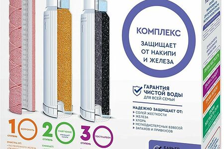 Комплект сменных картриджей для фильтров. Применяется в трехступенчатых системах водоочистки "Барьер ПРОФИ Complex". Эффективная защита от: железа, солей жесткости, тяжелых металлов, хлора, механических частиц, неприятных запахов и привкусов. Протестировано по стандарту NSF (США) на максимальное давление 30 АТМ. 4-х кратный запас прочности. Очистка производится в три этапа: