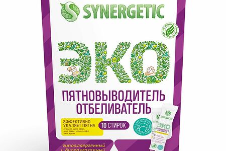 Биоразлагаемый гипоаллергенный отбеливатель-пятновыводитель с активным кислородом SYNERGETIC в стиках – универсальное средство для эффективного удаления загрязнений и трудновыводимых пятен от масла, жира, какао, ягод, травы, чернил, кофе, вина, крови на цветном и белом белье из натуральных и синтетических тканей. Подходит для предварительной обработки пятен, замачивания белья, ручной и машинной стирки. Может использоваться как усилитель моющих средств и отбеливатель в автоматических стиральных машинах всех типов. Гипоаллергенный пятновыводитель подходит для детской одежды и белья людей с чувствительной кожей. Полностью выполаскивается из волокон ткани. Комбинация энзимов, растительных ПАВ и активного кислорода эффективно удаляет въевшиеся и застарелые пятна с волокон ткани даже в холодной воде. Не содержит хлора, красителей, ароматизаторов, фосфатов, фосфонатов, акрилатов, агрессивных ПАВ, SLS, SLES, ЭДТА, оптических отбеливателей. Биоразлагаемые компоненты не вредят микрофлоре септических установок. Биоразлагаемый пятновыводитель имеет экомаркировку "Листок жизни". Этот знак на упаковке — гарантия экологической безопасности продукта для человека и окружающей среды.