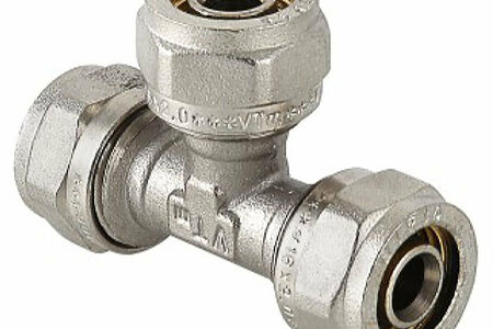 Латунный никелированный обжимной фитинг для соединения трех металлополимерных труб (тройник). 20 х 20 х 16.