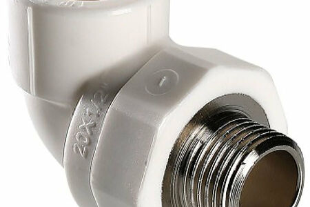 Двухсторонний металлопластиковый фитинг для соединения под углом 90 градусов друг к другу полипропиленового трубопровода и компонента инженерной системы с резьбовым подключением, 25 х 1/2". Резьба фитинга - наружная трубная, по ГОСТу 6357.