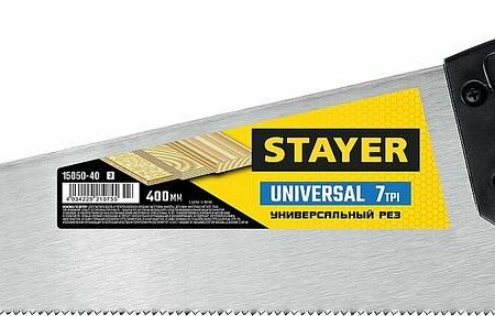 Ножовка с универсальными прямыми закаленными зубьями, остро заточенными с двух сторон, обеспечивает быстрый точный рез вдоль и поперек волокон, для средних заготовок, фанеры, ДСП, МДФ- Длина полотна: 400 мм- Шаг зуба: 7 TPI- Тип зуба: 2D - Тип ножовки: Ножовка универсальная - Материал полотна: Пружинная сталь - Материал рукоятки: Пластиковая - Тип закалки: ТВЧ- закалка - Тефлоновое покрытие: нет - Складное полотно: нет