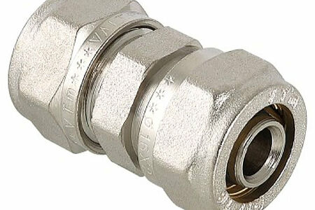 Двухсторонний прямой латунный никелированный фитинг для соединения металлополимерных труб, диаметр 16 мм