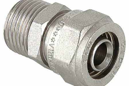 Двухсторонний прямой латунный никелированный фитинг для соединения металлополимерной трубы и компонента системы с резьбовым подключением. Резьба фитинга - наружная трубная по ГОСТу 6357, 26 х 1"Cерия VTm.301.N