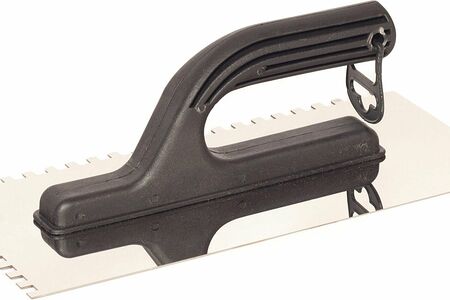 Гладилка прямая (зубчатая) – изготовлена из нержавеющей стали, оснащена эргономичной пластиковой ручкой. Используется для качественного нанесения различных сухих смесей, их распределения по поверхности, а также сглаживания неровностей и швов. В ремонтных, а так же отделочных работах гладилка малярная и штукатурная используется повсеместно. Она незаменима в случаях, когда необходимо нанести много раствора тонким слоем. Применяется для шпаклевки, обычной и декоративной штукатурки, клея и различных строительных смесей.