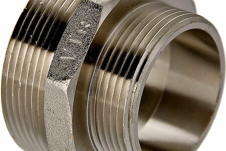Резьбовой фитинг – ниппель переходной. Обеспечивает соединение элементов трубопровода разного диаметра. Выполнен из латуни CW617N (евростандарт EN12165) горячим штампованием с последующим никелированием. Резьба обоих патрубков – наружная (тип – цилиндрическая трубная, ГОСТ 6357, ISO 228, EN10226). Насечки на резьбе способствуют удержанию герметизирующего материала (например, сантехнического льна). Наличие шестигранного (под гаечный ключ) участка корпуса облегчает монтаж соединения. Максимальная температура использования ниппеля составляет 250 градусов Цельсия (при максимальном рабочем давлении 2,7/1,7 бар – для моделей условным диаметром до/более 1”).