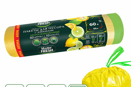 Пакеты для мусора Master FRESH серии АРОМА обеспечивают чистоту и гигиену в квартире. Двойная арома добавка LEMON внедрена в структуру полиэтилена, долго держится, поэтому пакеты даже без упаковки долго не теряют своего аромата. Пакеты для мусора имеют усиленный аромат лимона, который поможет скрыть неприятные запахи. Удобны для сбора и вывоза мусора, занимают мало места, практичны в использовании. Специальная перфорация позволяет легко отделить пакет от рулона.Пакеты для мусора Master FRESH АРОМА снабжены специальными прочными завязками, с помощью которых можно легко завязать пакет, предотвратив тем самым выпадение мусора и появление неприятного запаха.
