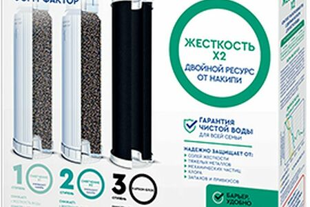 Комплект сменных картриджей с двойным ресурсом от накипи. Способен эффективно умягчать жесткую воду, удалять из нее все присутствующие вредные примеси: хлор, хлороформ, тяжелые металлы, нерастворимые частицы, мелкодисперсные взвеси, фенол, гормоны, антибиотики, запахи и привкусы.
