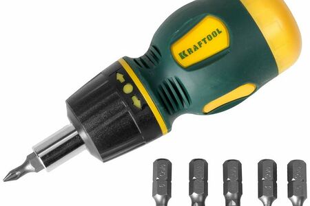Компактная реверсивная отвертка KRAFTOOL c прочным трещоточным механизмом. Небольшой размер и хранение бит внутри рукоятки дают возможность всегда иметь отвертку под рукой- Количество предметов: 7 шт- Материал бит: Cr- Mo - Кейс: нет - Хвостовик бит: 1/4"