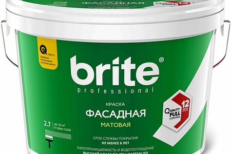 Краска Brite Professional Quality Full Control фасадная матовая. Образует долговечное «дышащее» покрытие, устойчивое к атмосферным воздействиям и перепадам температур, в том числе в условиях северных широт.