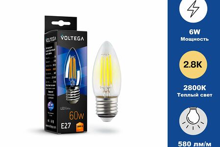 Лампа Свеча светодиодная, Candle ( transparent ) - Ваттность 6W. Цоколь Е27. Цветовая температура 2800К.