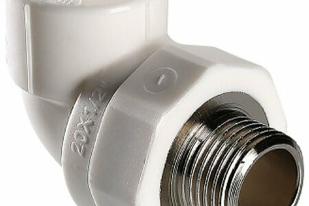 Двухсторонний металлопластиковый фитинг для соединения под углом 90 градусов друг к другу полипропиленового трубопровода и компонента инженерной системы с резьбовым подключением, 32 х 3/4". Резьба фитинга - наружная трубная по ГОСТу 6357.