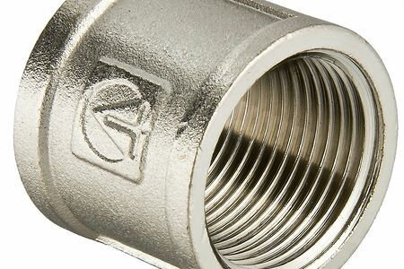 Соединительная муфта с внутренней резьбой. Изготовлена методом объемного горячего объемного прессования из сантехнической латуни марки CW617N (европейский стандарт EN12165) с гальваническим нанесением никелевого покрытия. Цилиндрическая трубная резьба муфты совместима также с наружной конической по ГОСТ 6211 (ISO R7). Максимальное избыточное давление применения фитинга определяется максимальной температурой рабочей среды, типоразмером изделия (условным диаметром до/более 1”): при 120 градусов Цельсия – 40/25, 200 – 3,0/2,7, 250 – 2,7/1,7 бар.